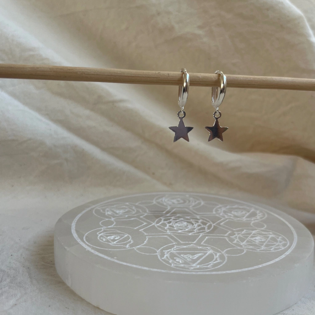 Brinco lindo no formato de argolas com pingentinho de estrelas.